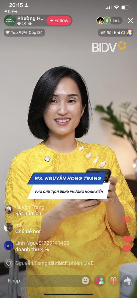 | Trước đó, ngày 30/3/2026, tại số 26 phố Báo Khánh, UBND phường Hoàn Kiếm phối hợp với Quỹ Hỗ trợ bảo tồn di sản văn hóa Việt Nam, TikTok Việt Nam và các đơn vị liên quan tổ chức lễ ra mắt Trạm truyền thông số – Studio dLocals Hoàn Kiếm. Đây là mô hình truyền thông số triển khai tại cấp cơ sở, hướng tới tăng cường kết nối giữa chính quyền với người dân, đồng thời đổi mới phương thức truyền thông chính sách trong bối cảnh đẩy mạnh chuyển đổi số. Ngay sau lễ ra mắt, phiên livestream số 1 trong chuỗi chương trình truyền thông chính sách thuế cho hộ kinh doanh với chủ đề “Hoàn Kiếm đồng hành, hiểu đúng chính sách, vững bước kinh doanh”đã được tổ chức từ 20h00 đến 23h00 trên kênh TikTok chính thức của phường. Chương trình có sự tham gia của đại diện UBND phường Hoàn Kiếm, cơ quan Thuế cơ sở 1 TP. Hà Nội cùng các nhà sáng tạo nội dung trên nền tảng số (Hoa hậu vỉa hè, Chị gái kế toán), góp phần tạo nên không gian trao đổi trực tuyến sôi động, gần gũi với người dân. Phiên livestream nhận được nhiều phản hồi tích cực từ người xem với lượng tương tác cao. Cách thức truyền tải mới mẻ, dễ tiếp cận đã giúp chương trình lan tỏa hiệu quả đến cộng đồng hộ kinh doanh, qua đó mở ra hướng tiếp cận mới trong ứng dụng công nghệ số vào công tác truyền thông chính sách. |